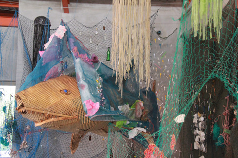 ศิลปะจากขยะในทะเล การนำขยะที่เก็บได้จากทะเลมาสร้างสรรค์เป็นผลงานทางศิลปะ เพื่อสะท้อนให้เห็นถึงปัญหาการทิ้งขยะที่ไม่สามารถย่อยสลายได้ลงทะเล โดยศิลปิน คุณป้อม ประสพสุข